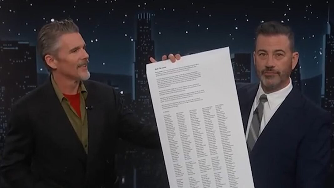 Jimmy KimmelDetrás de esto y está vítores de todos: incluso ABC ha firmado una carta de apoyo en su nombre para una carta firmada en su nombre incluso después de tratar de hacerle llevarlo a … y sí, sí Ethan HawkEn la mezcla!