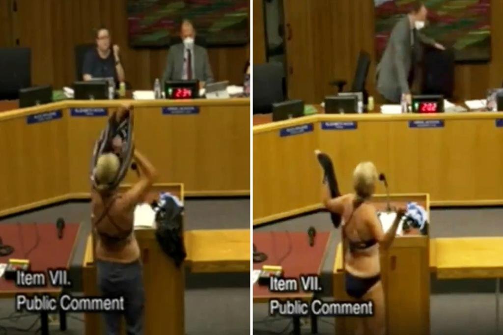 La activista local de los derechos de California, Beth Bourne, protestó la política de permitir el acceso a los vestuarios de las niñas por parte de estudiantes transgénero a un bikini en una reunión local de la junta escolar.