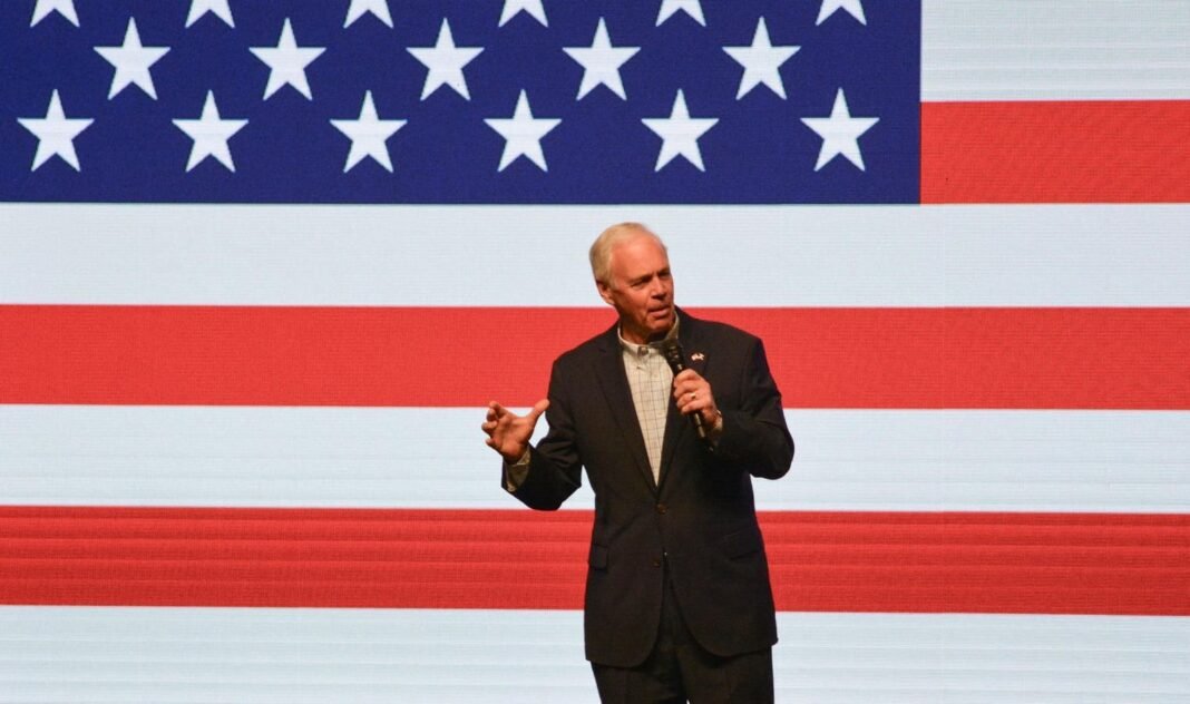 El senador estadounidense Ron Johnson (R-WI) habló durante un ayuntamiento en Green Bay de Wisconsin a principios de este año. Johnson ha introducido leyes que evitarán el cierre oficial a través de una resolución automatizada (foto de Robin Legrand/AFP a través de Getty Fig.)