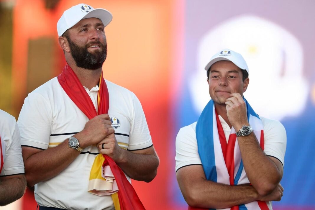 Farmingdale, Nueva York – 27 de septiembre: (LR) Zona del equipo Rahm y el Trofeo Victor Hovland en Europa descubrieron que el curso negro del equipo Europa era una copa de jinete de 20220 el domingo 21 de septiembre de 2021, 2021 el 21 de septiembre de 2021. (Foto Jared C Tilton/Getty Fig.)