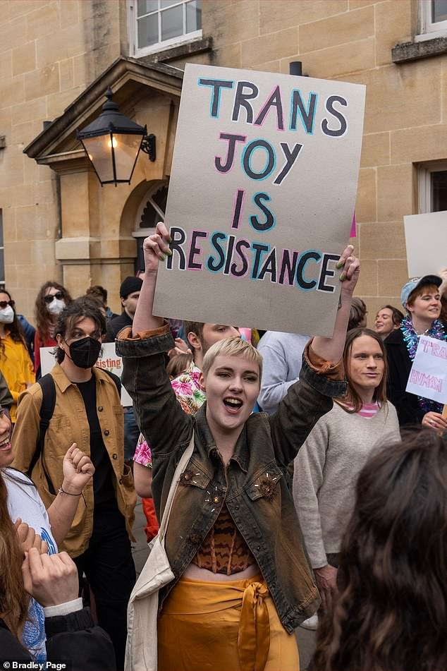Se ven manifestantes afuera del Oxford Union donde Kathleen Stock habló con los estudiantes el año pasado.