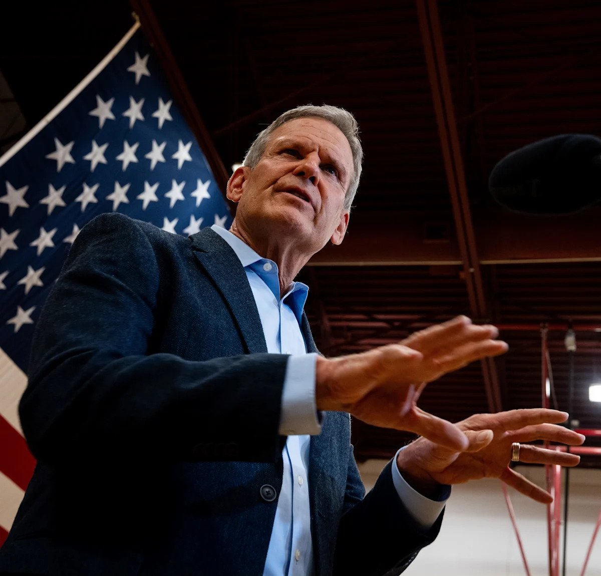El gobierno Bill Lee responde preguntas de la prensa durante su visita a la Escuela Cristiana de Clarksville en Clarksville, Tennessee, el martes 25 de noviembre de 2025.