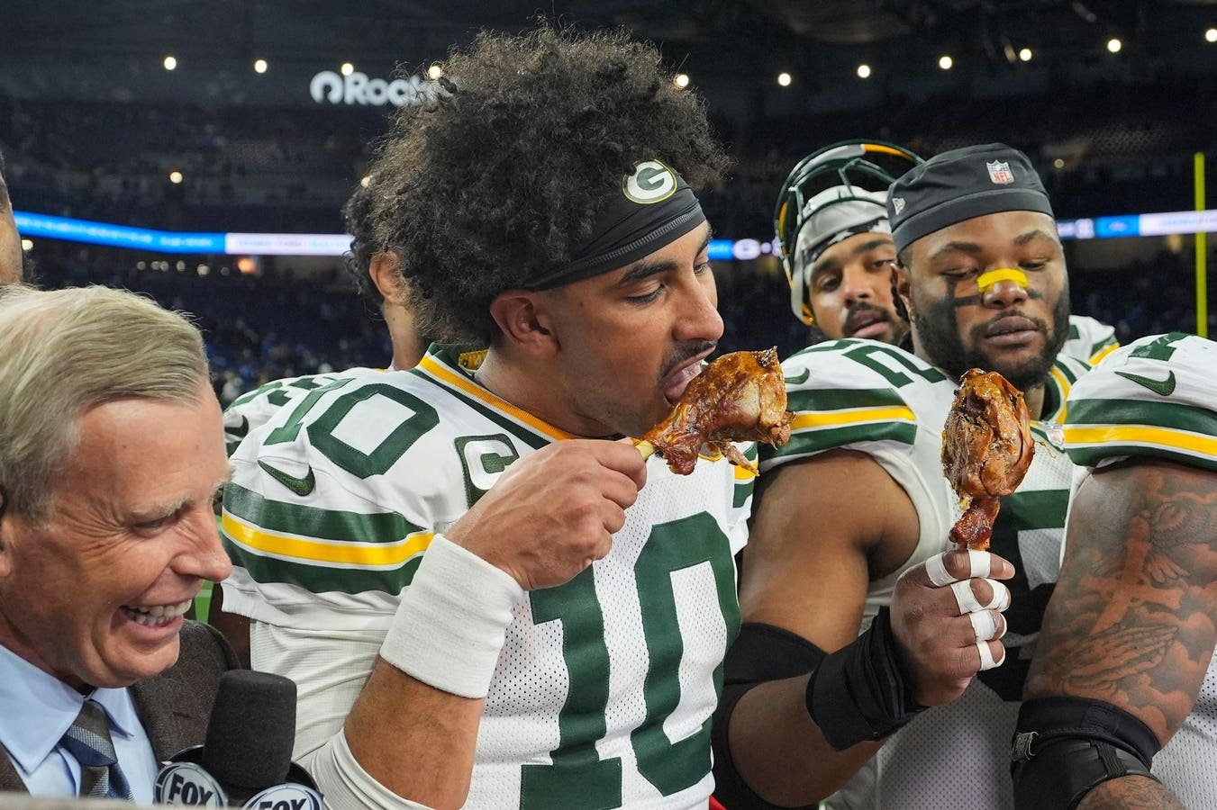 El mariscal de campo de los Green Bay Packers, Jordan Love (10), se come una pierna de pavo después de llevar a su equipo a vencer a los Detroit Lions, 31-24, el jueves.