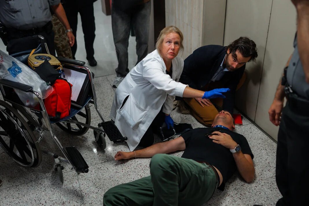 El oponente de Ben Elibol lo retuvo y lo trató hasta que llegó una ambulancia, dijeron testigos. Un video lo mostró en una abrazadera de cuello mientras los paramédicos sacaban su rueda fuera del edificio en una camilla. Los otros periodistas, el Decano de Moisés y Olga Fedorova, jefe de Amnewework, eran independientes, un fotógrafo independiente cuyos clientes incluyen en serio The Associated Press.
