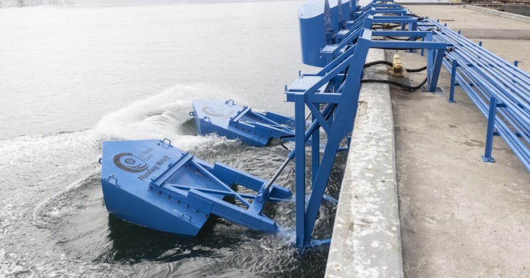 Eco Wave Power Blue Fluts se arrojan a los EE. UU. Durante la apertura del Proyecto de Potencia de la Primera Oava en los Estados Unidos en Ultasia.