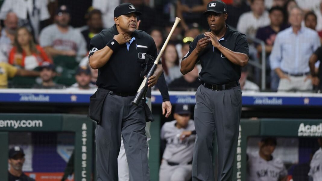 Las novenas entradas de los Yankees de Nueva York 3-0 contra los Astros de Houston se retrasaron el jueves por la noche cuando los árbitros confiscaron un bate utilizado por el jardinero de Astroos Taylor Tramel.