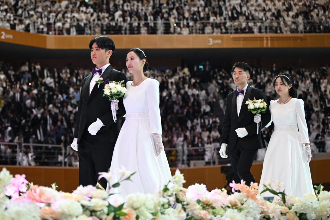 Las parejas asistieron a una boda masiva en el Centro de la Paz Chewsmim en Gapiang, Corea del Sur, el 12 de abril de 2025.