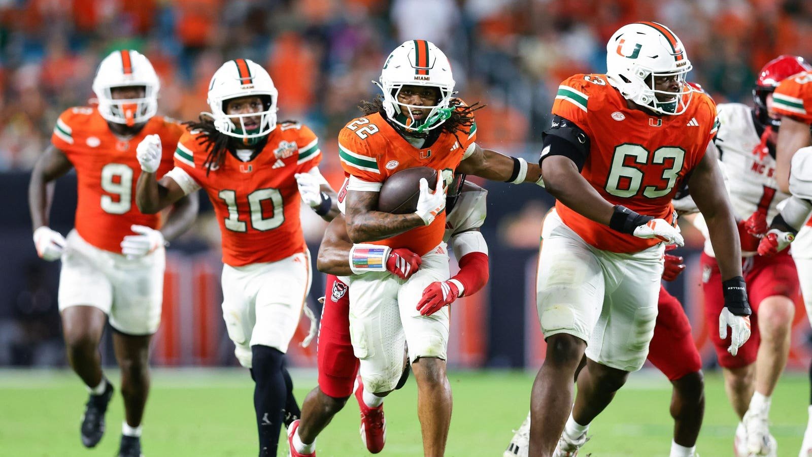 MIAMI GARDENS, FLORIDA – Girard Pringle Jr. # 22 de los Miami Hurricanes impulsa el balón contra el NC State Wolfpack durante el tercer cuarto del juego en el Hard Rock Stadium el 15 de noviembre de 2025 en Miami Gardens, Florida. (Foto de Megan Briggs/Getty Images)