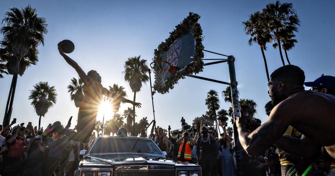 En el centro de All the Madness, un fin de semana para honrar a Kobe Bryant, que una vez intentó sumergirse en la cancha en 2000 y Nick Uns fue el último ícono de la pelota callejera que había influido en el paseo marítimo. Unmon, que ha subido a la cancha de baloncesto con un sombrero de plástico naranja en la cabeza, es el fundador y CEO de la misma. VenisballEl