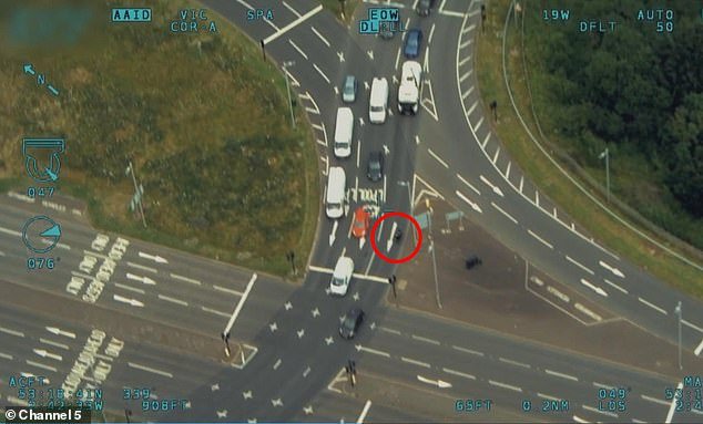 El siguiente clip muestra a los hombres siendo rastreados por un helicóptero del Servicio Aéreo de la Policía Nacional mientras intentan evitar ser capturados pasándose un semáforo en rojo antes de conducir en sentido contrario por una vía de acceso en la M56 en la hora pico.