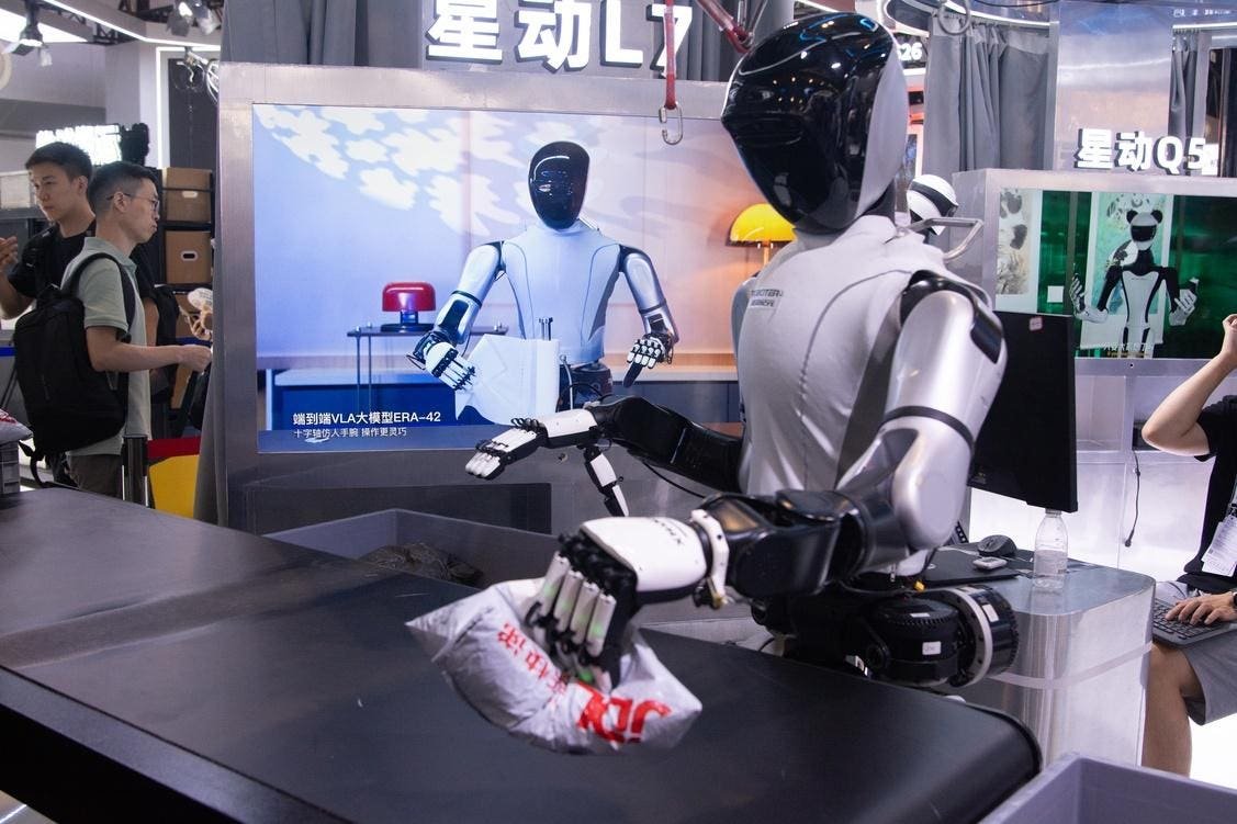 Una descripción general muestra robots humanoides de XIngdong L7 trabajando en una línea de ensamblaje en ROBOTERA en el Nuevo Centro de Exposiciones de Shanghai durante el día inaugural de la Conferencia Mundial de Inteligencia Artificial (WAIC) 2025 en Shanghai, China, el 26 de julio de 2025. (Foto de Ying Tang/NurPhoto vía Getty Images)