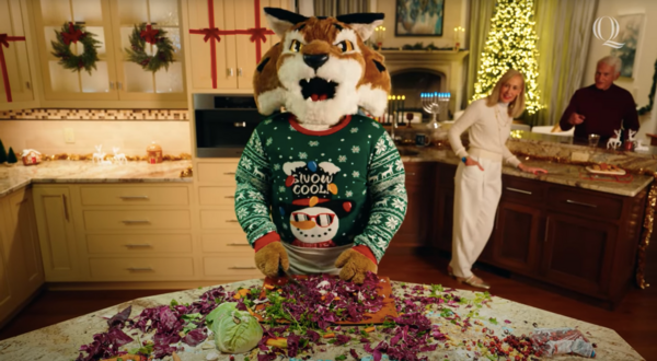 Este cómic muestra a la mascota de Quinnipiac, Boomer the Bobcat, mientras se prepara caóticamente para recibir a los miembros de la comunidad en su casa para la cena de Navidad. A pesar de percances como derramar un plato de verduras variadas en el suelo y batir lo que parece puré de papas con tanta frenesí que vuelan, Boomer termina preparando un hermoso plato (pavo asado, judías verdes, huevos duros y más) para sus encantados invitados.