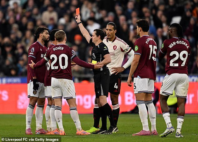 El brasileño recibió una tarjeta roja en la derrota de los Hammers por 2-0 ante el Liverpool en el estadio de Londres el domingo después de recibir dos tarjetas amarillas por disentir, incluida una discusión con el árbitro.