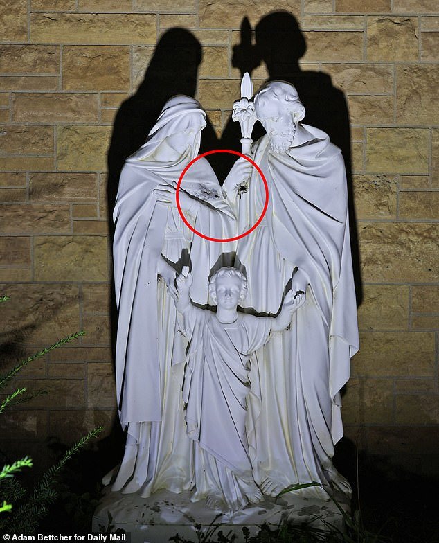 Se ve una estatua de la Virgen María en el agujero de la bala, el miércoles por la mañana, el análisis convirtió un hermoso símbolo para recordar el horror expuesto en la Iglesia Católica.