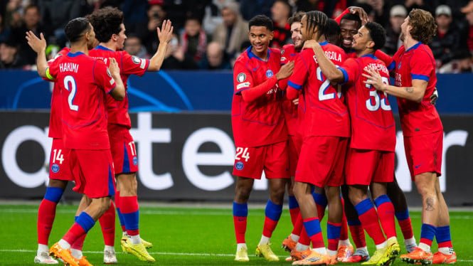 VIVA – El Paris Saint-Germain luce en la cima cuando se enfrente al Bayer Leverkusen en la tercera jornada de la Liga de Campeones en el estadio Bayer Arena, el miércoles 22 de octubre de 2025, WIB. Los de Luis Enrique se impusieron por 7-2 en un partido marcado por dos tarjetas rojas y dramatismo de penaltis.
