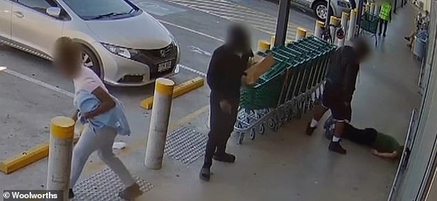 En un impactante vídeo se puede ver a un empleado de Woolworths tirado en el suelo inconsciente después de haber sido golpeado en el aparcamiento de la tienda.