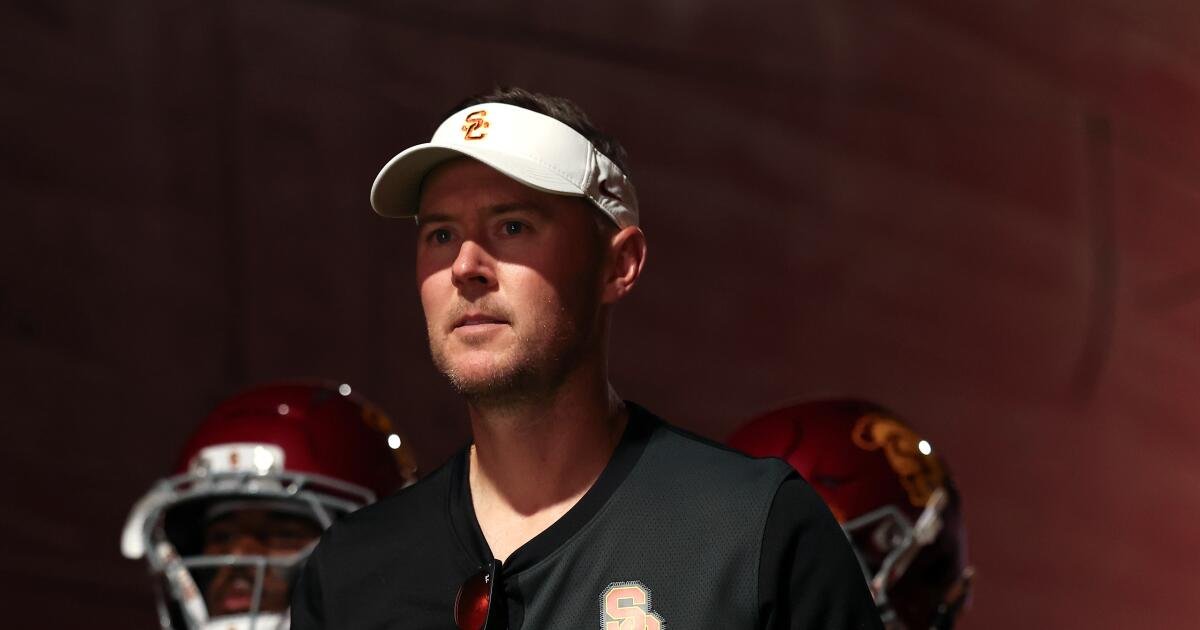 El entrenador de la USC, Lincoln Riley, habló con Zeden Miaver mientras ganaba el estado de Missouri el sábado.
