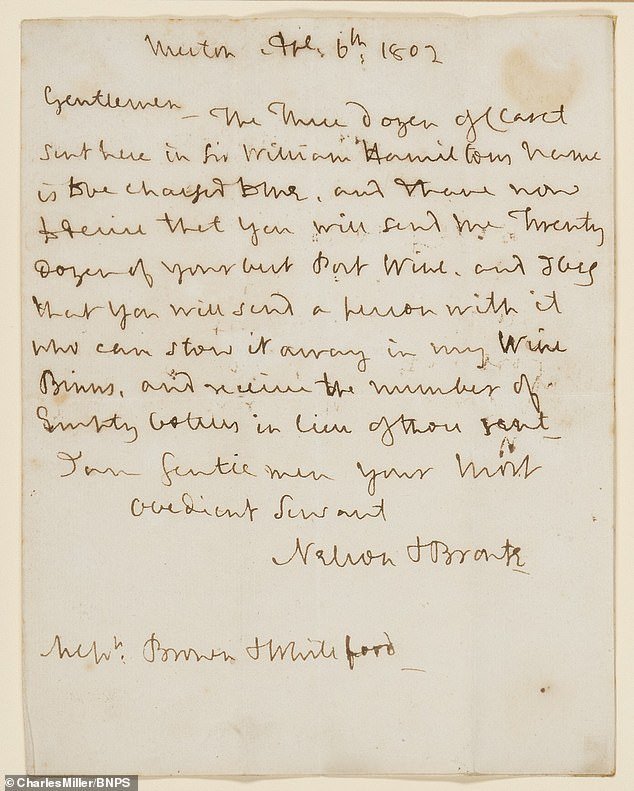 Cómo Lord Nelson pagó la factura del vino del marido de su amante: el héroe mujeriego de la Batalla de Trafalgar ordenó ‘tres docenas de clarete’ para la madre del compañero cornudo de su amado hijo, revela una carta