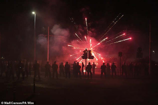 Los manifestantes lanzaron fuegos artificiales a los agentes de gardaí cerca del hotel CityWest, mientras se desataba el caos afuera de un hotel de Dublín que albergaba a solicitantes de asilo (Imagen: disturbios el miércoles por la noche)