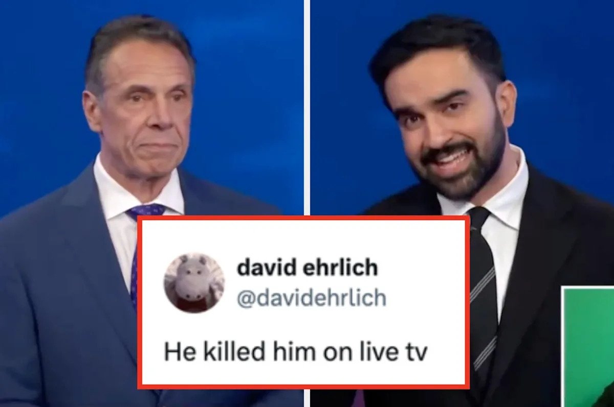 Captura de pantalla del debate televisivo con Andrew Cuomo mirando hacia abajo y otra persona hablando, tuiteando leyendo un texto.