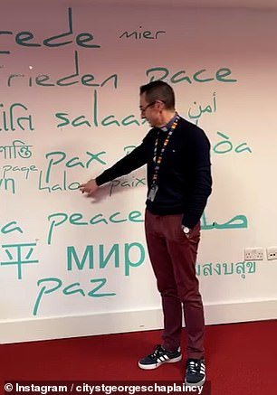 Reverendo Worsfold Dijo: ‘Fue hermoso tener la palabra paz en tantos idiomas en esta pared’.