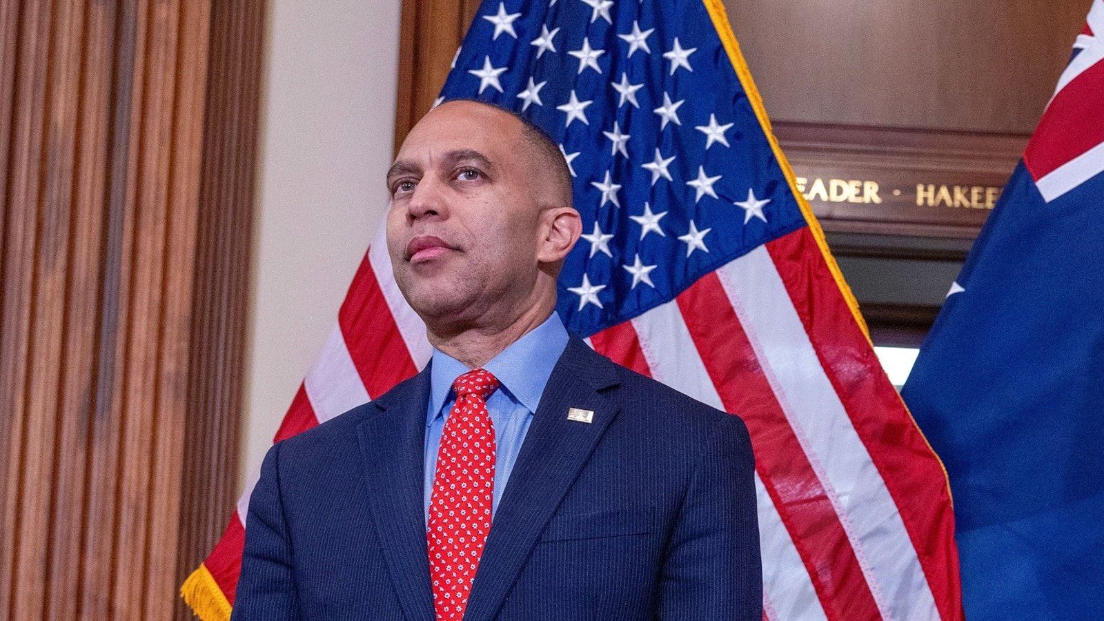 El líder de la minoría, Hakeem Jephries, espera al primer ministro australiano, Anthony Albanese, durante una oportunidad para tomar fotografías en el Capitolio, el 21 de octubre de 2025.