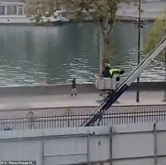 El vídeo muestra a los dos ladrones bajando una gran escalera desde una cesta de reparto mecánica estacionada junto al famoso museo del centro de París.