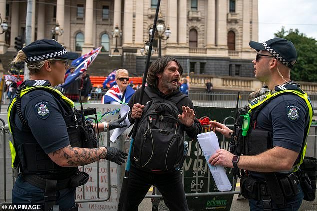 En la imagen se muestra a un manifestante negándose a ser registrado en una manifestación de la Marcha por Australia en Melbourne.
