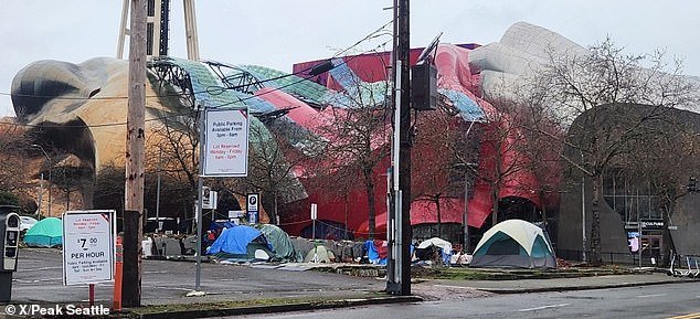 Los usuarios de las redes sociales dijeron que el campamento para personas sin hogar cerca del museo y la icónica Space Needle (en la foto) comenzó hace unos meses.