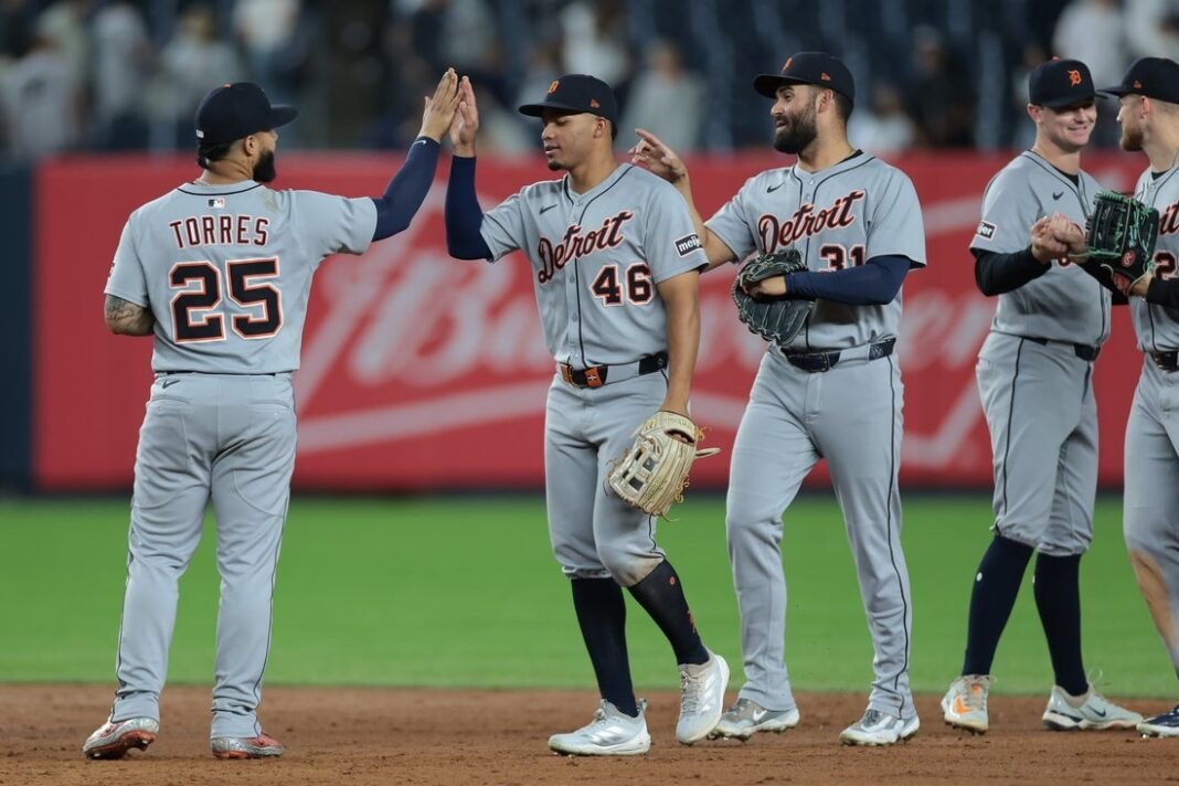 10 de septiembre de 2025; Bronx, Nueva York, Estados Unidos; Gleber Torres (25), el segundo base de los Tigres de Detroit, celebró con sus compañeros de equipo después de derrotar a los Yankis de Nueva York en el estadio Yanki. Crédito obligatorio