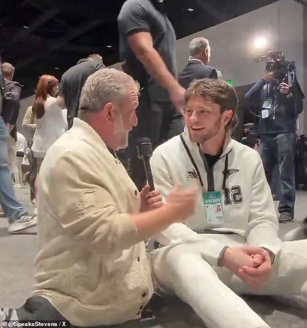 La estrella de los New England Patriots, Jack Gibbons, se unió a los periodistas en la cancha para una entrevista durante la noche inaugural del Super Bowl LX.