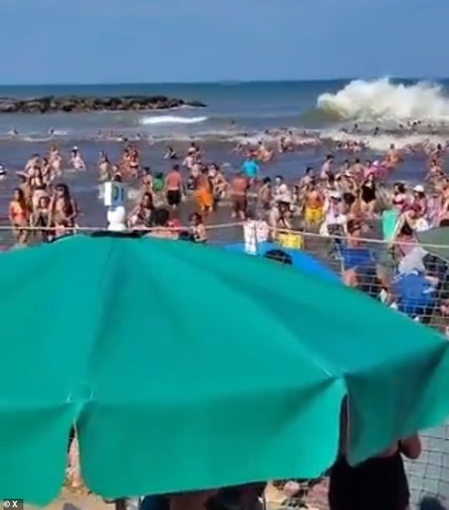 En el dramático clip, filmado el lunes por la tarde en la ciudad costera de Santa Clara del Mar, se puede ver una rápida ola de agua barriendo una playa abarrotada mientras la gente sale del agua para buscar seguridad en la arena.