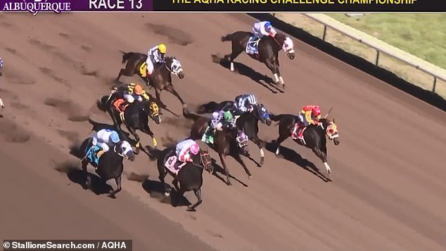 Michael Joiner fue suspendido después de que su caballo (izquierda, en azul) diera positivo por metanfetamina después de la gran carrera de Nuevo México.