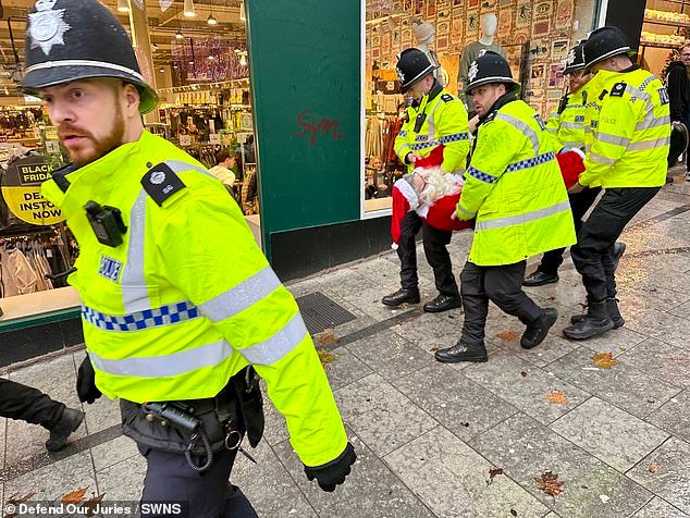 Este es el momento en que la policía se lleva a rastras a un hombre vestido como Papá Noel después de haber sido arrestado por protestar contra Acción Palestina.