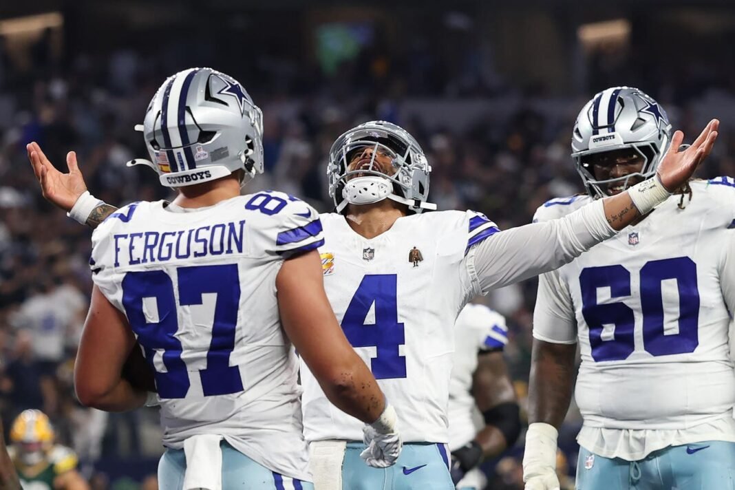 Arlington, Texas – 28 de septiembre: Dak Prescott #4 de los Dallas Cowboys celebra lanzando un toque de Toc a Jake Ferguson #87 de los Dallas Cowboys contra los Green Bay Packers durante el tercer cuarto del juego en el AT&T Stadium el 28 de septiembre de 2025 en Arlington, Texas. (Foto de Stacy Revere/Getty Images)