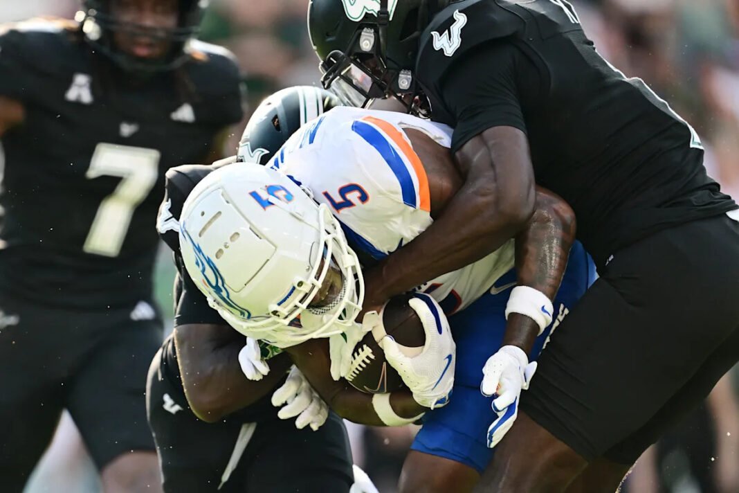 Janti, ahora un camuflaje con Las Vegas Raider, no estaba en el campo el jueves por la noche, pero no es fácil explicar la pérdida que Boys State estaba ausente por su estrella Rashra. El QB Maddax Madsen fue solo 25-Off-46 para 225 yardas y la pelota cayó el cuarto en el cuarto trimestre de la región de la USF, para borrar cualquier posibilidad de regresar.