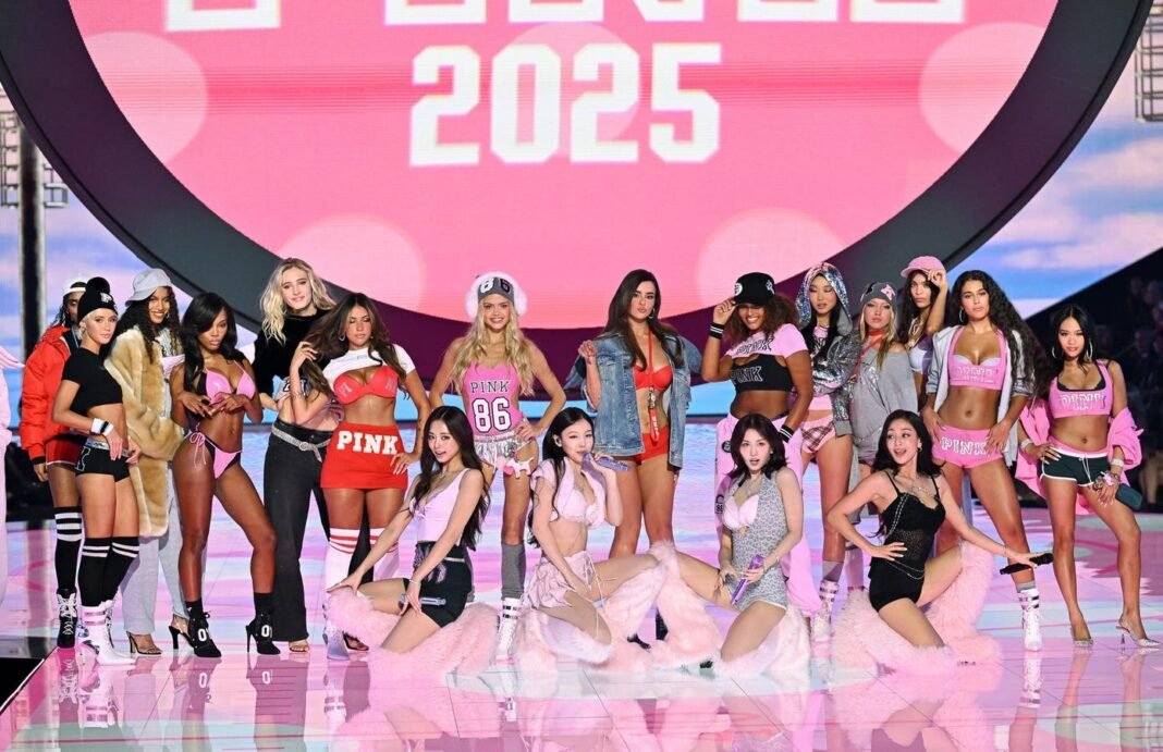 Tzuyu, Nayeon, Momo y Jihyo de TWICE posan con modelos en la pasarela durante el desfile de modas de Victoria’s Secret el miércoles 15 de octubre de 2025 en el distrito de Brooklyn de Nueva York. (Foto de Evan Agostini/Invision/AP)