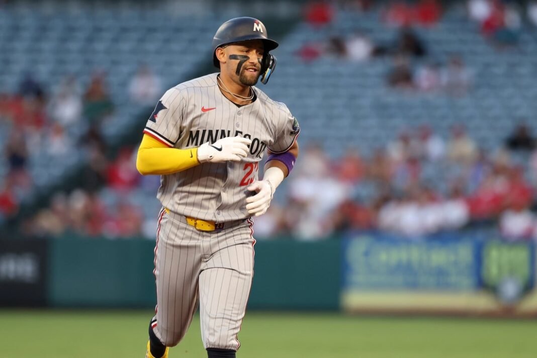 8 de septiembre de 2025; Anahim, California, Estados Unidos; El tercer arroz Basan Lewis de los Minnesota Twins (25) corrió alrededor de la base después de anotar dos carreras durante las segundas entradas contra Los Ángeles Angeles en el estadio Angel. Crédito obligatorio