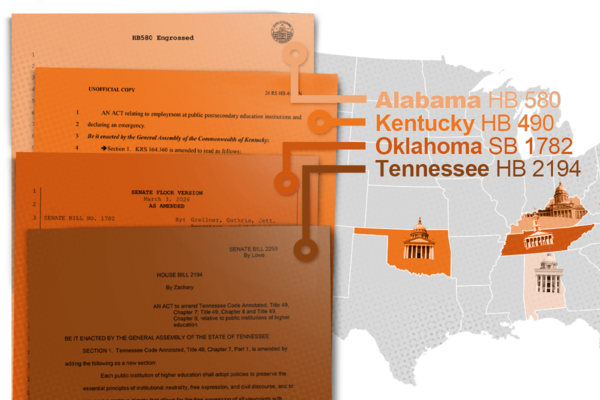 Muchas legislaturas estatales están terminando sus sesiones legislativas este mes, y se enviarán conjuntos de proyectos de ley a los escritorios de los gobernadores en los próximos días y semanas. Al menos cuatro estados han adoptado una legislación integral que, de promulgarse, tendrá impactos significativos en la tenencia, la libertad académica y la gobernanza compartida en colegios y universidades públicas.