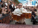 Como camarero, Oliver Streuempel es experto en llevar algunas tazas de cerveza al mismo tiempo y este año tomó un desafío récord mundial.