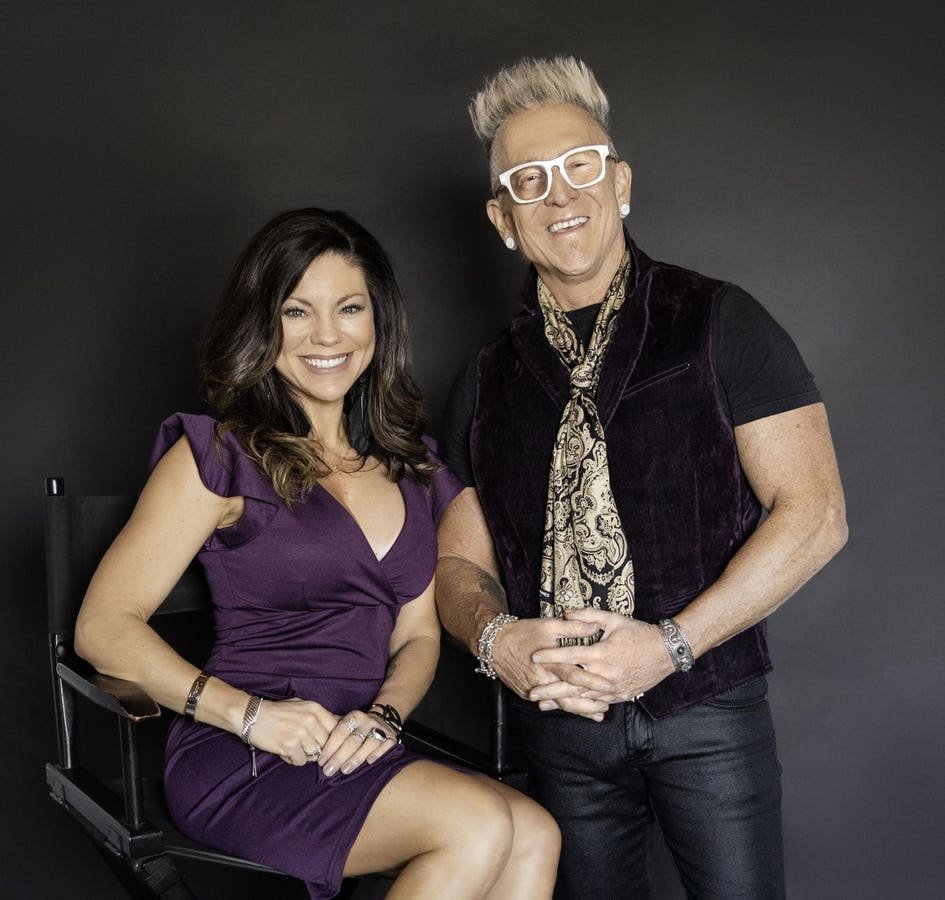El baterista de Rockstar, Mark Schulman, y la entrenadora de Neuro-Renduring, Heather Crider, alientan a los asistentes al comienzo de Rockstars.