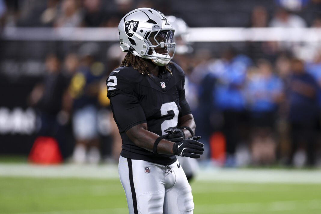 Ashton Ganti #2 de Las Vegas Raider, Nevadar Las Vegas, se ha calentado antes de jugar al fútbol de la NFL contra los Chargers de Los Ángeles en el estadio Alligient el 15 de septiembre de 2025.