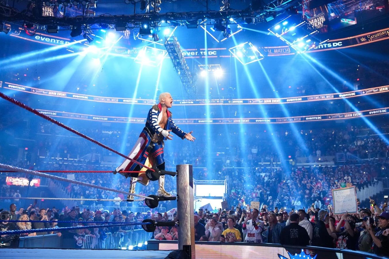 - Fatu se lanzó desde el tensor superior hacia Rhodes y el grupo de guardias de seguridad en el exterior. Los árbitros intentaron escoltar a Fatu hacia atrás, pero Rhodes lo atacó por detrás. La pelea regresó al ring y Rhodes arrojó a Fatu afuera antes de lanzarse.