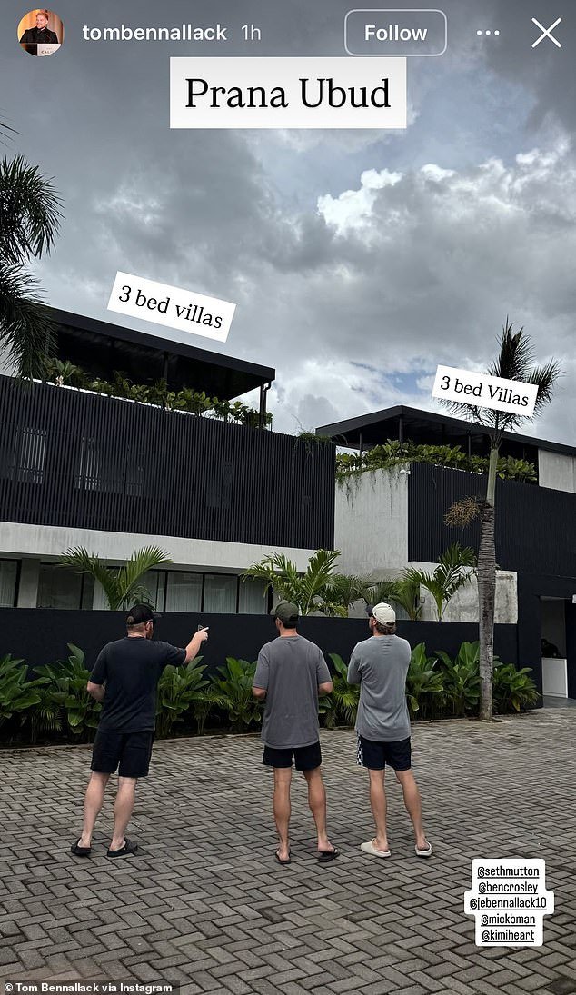 El marido de Tess Crosley, Ben, viajó a Bali con varios de sus amigos para ver varias de sus propiedades de inversión. Crosley fue etiquetada en la foto por su amigo Tom Bennallock, quien parecía estar haciendo un recorrido por sus nuevas villas en Bali.