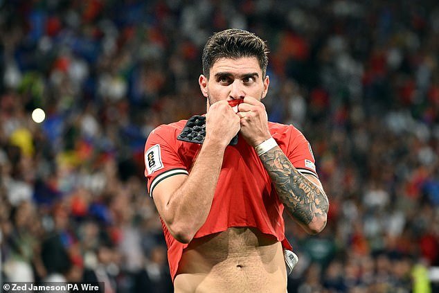 Luego de celebrar con sus compañeros, Neves besó su camiseta número 21 y lo mostró al cielo en honor a Jota.
