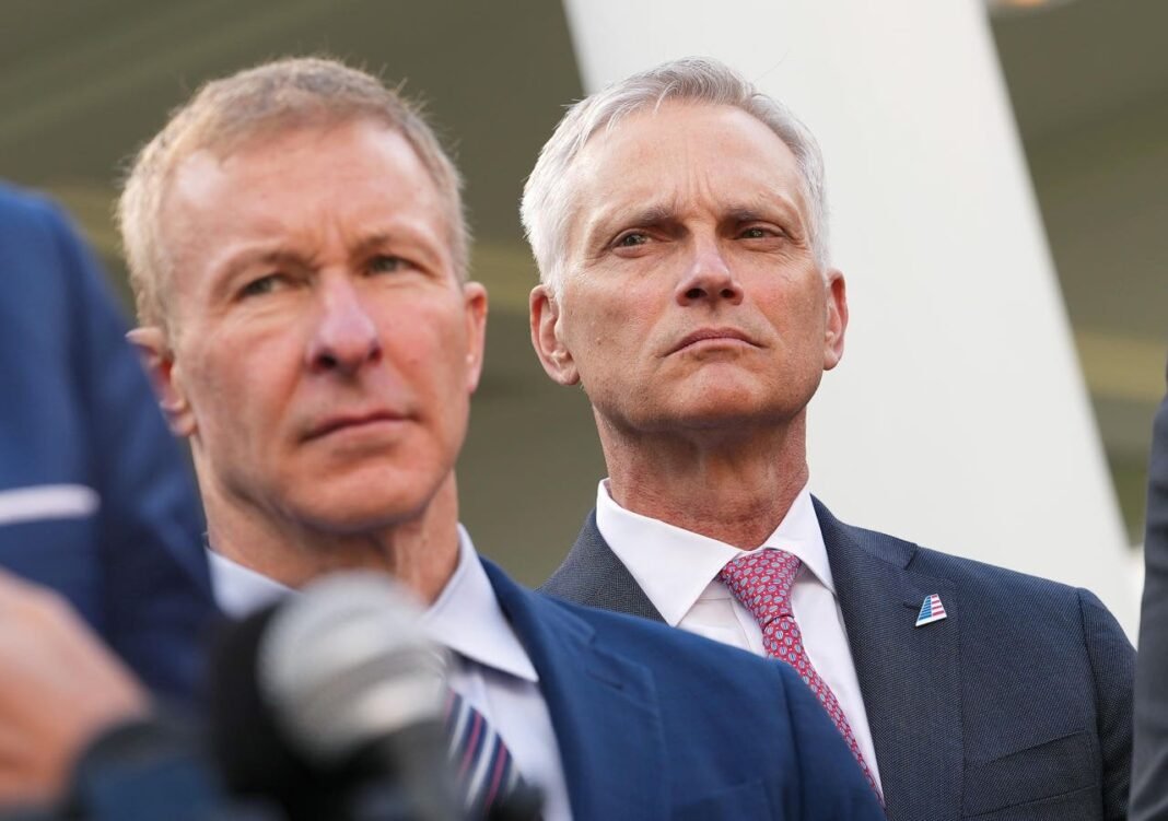 El director ejecutivo de United, Scott Kirby (izq.), y el director ejecutivo estadounidense, Robert Isom, escuchan mientras el secretario del DOT, Sean Duffy, habla con los periodistas frente a la Casa Blanca el jueves. (Foto de Kevin Dietsch)