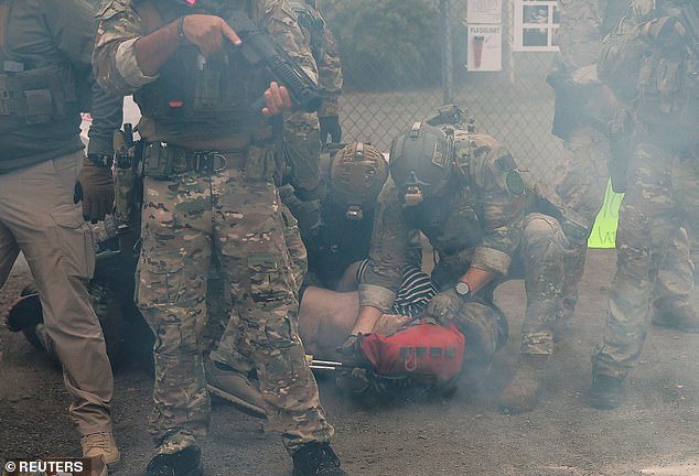 En Portland, el grupo se reunió en Waterfront Park alrededor del mediodía antes de que los manifestantes comenzaran a avanzar hacia la propiedad federal alrededor del mediodía. Hubo un enfrentamiento con las autoridades.