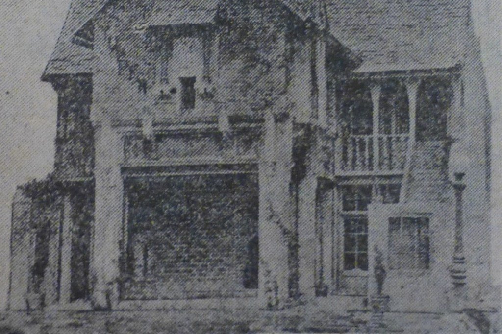 “La pizarra inglesa importada es un techo de agujero empinado y puntiagudo atado a una pelea ligeramente paloma. Una chimenea enorme prioriza toda la estructura de 45 pies de altura. Una imagen de tamaño natural de un soporte de fibra en la parte superior de la chimenea. El edificio está hecho con ladrillos seleccionados … se ve viejo … es antigua”. “.
