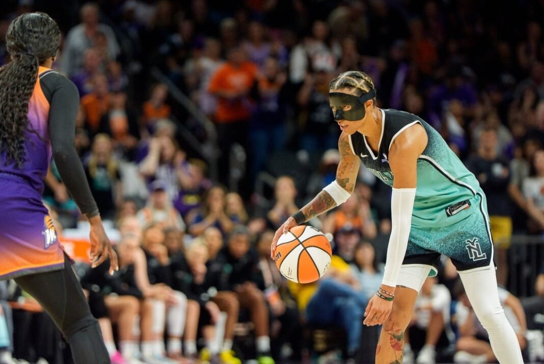 14 de septiembre de 2025; Phoenix, Arizona, Estados Unidos; La guardia de Nueva York Liberty, Natasha Claud (1), reaccionó al PHX Arena durante el tiempo extra contra Mercurio durante el tiempo extra contra Mercurio durante el juego de 2021 jugadas de la AMB. Crédito obligatorio: Figura de Alan Henry-Imagan