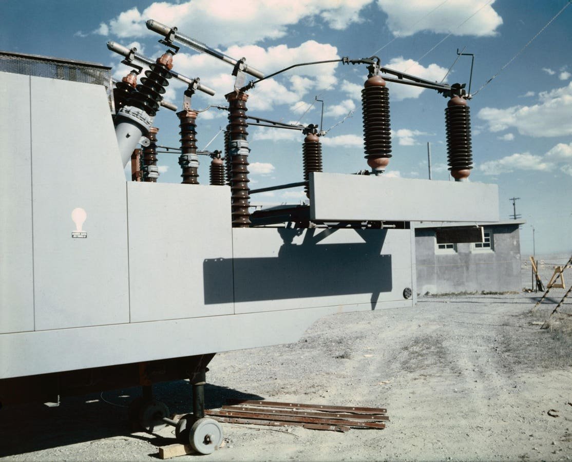 (Título original) Este es un primer plano de las terminales de subestación móvil de Utah’s Power and Light Company utilizadas para transmitir electricidad a Arco, Idaho, desde el Borax del Laboratorio Nacional Argonne, una planta de energía nuclear experimental de agua hirviendo en la Estación Nacional de Pruebas de Reactores de la Comisión de Energía Atómica.